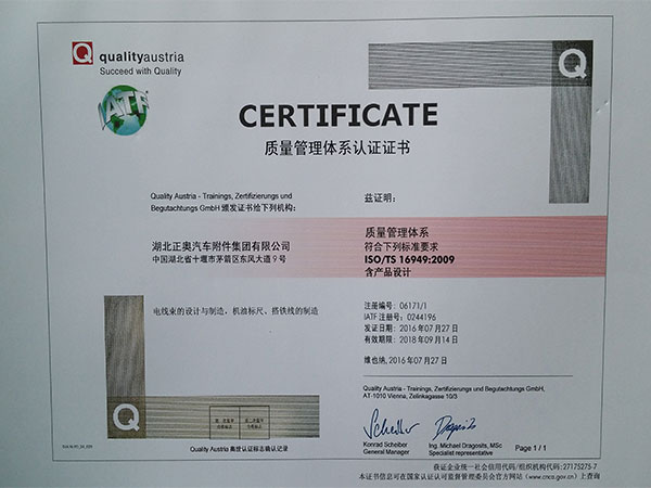 湖北正奧公司TS16949體系認證證書201608
